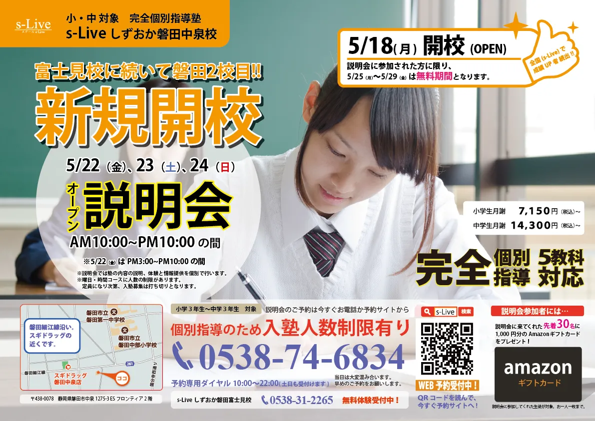 場所は、磐田市中泉1275-3のESフロンティア2階に位置するs-Liveしずおか中泉校です。参加希望者は、持ち物としてメモ帳と筆記用具を忘れずにお持ちください。この説明会の参加者には、特典として開校後の無料期間(5月25日~29日)の案内があるため、興味のある方は早めに申し込みを進めることをお勧めします。