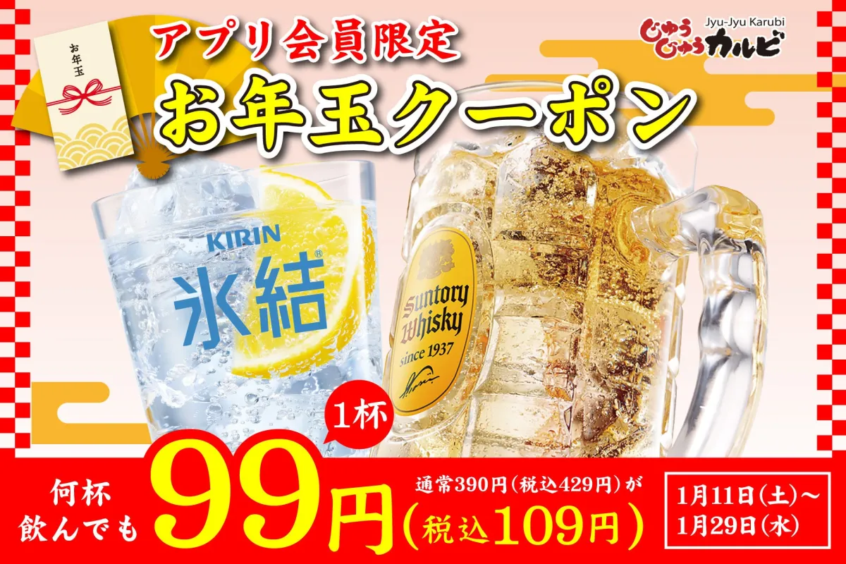 焼肉食べ放題の「じゅうじゅうカルビ」では、2025年1月11日からアプリ会員限定の特別キャンペーンを実施します。驚異的な価格、角ハイボールと氷結レモンサワーがなんと99円(税込109円)で楽しめるチャンスです。何杯飲んでもこの価格だから、仲間とワイワイ楽しむには最適な機会ですね。