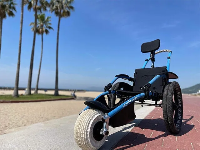 当ブースでは、特に注目したい機材があります。それは「マウンテントライク」と呼ばれる全地形対応型のアウトドア用車いすです。この革新的な車いすは、泥やぬかるみで手を汚さずに進むことができる独自の駆動システムを搭載しており、トレイルや砂利道といった不整地でも安定して移動が可能です。