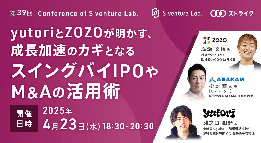 2025年4月23日(水)、株式会社ストライクが主催するイベント『S venture Lab.』が、東京都千代田区にて開催されます。このイベントでは、スタートアップ企業yutoriと、ファッションECサイトZOZOがそれぞれの成長戦略とM&A実績について語ります。