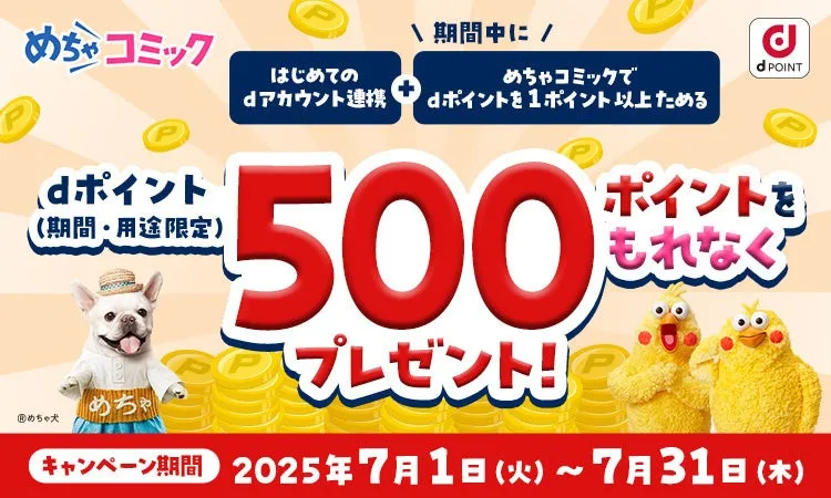 特典は最大500ポイントも可能で、キャンペーン期間は2025年7月1日から7月31日まで。この機会に、dアカウントをお持ちの方はぜひめちゃコミックを通じてお得にマンガを楽しんでください。