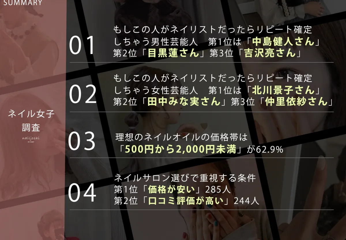 調査から、ネイルサロンを選ぶ際には価格が最も重要視されていることがわかりました。高品質でリーズナブルな価格帯が求められており、口コミ評価もあわせて重要な要素とされています。特に、利用しやすい雰囲気やリラックスできる空間も人気ポイントとなっています。