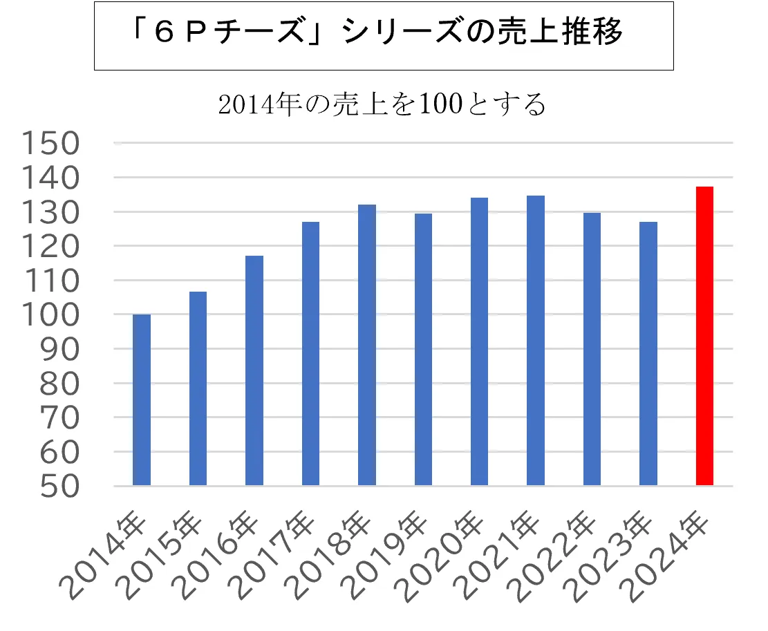 「6Pチーズ」は1954年に登場し、現在も国内№1のチーズとして幅広い世代から支持されています。しかし、若年層の購入率が低いという課題も抱えていました。このため、雪印メグミルクは2024年から、朝食の新習慣を提案するプロモーションや、他企業とのコラボレーション、100周年記念商品の展開を行い、購買層を拡大することに成功しました。その結果、2024年度には過去最高の売上を記録しました。