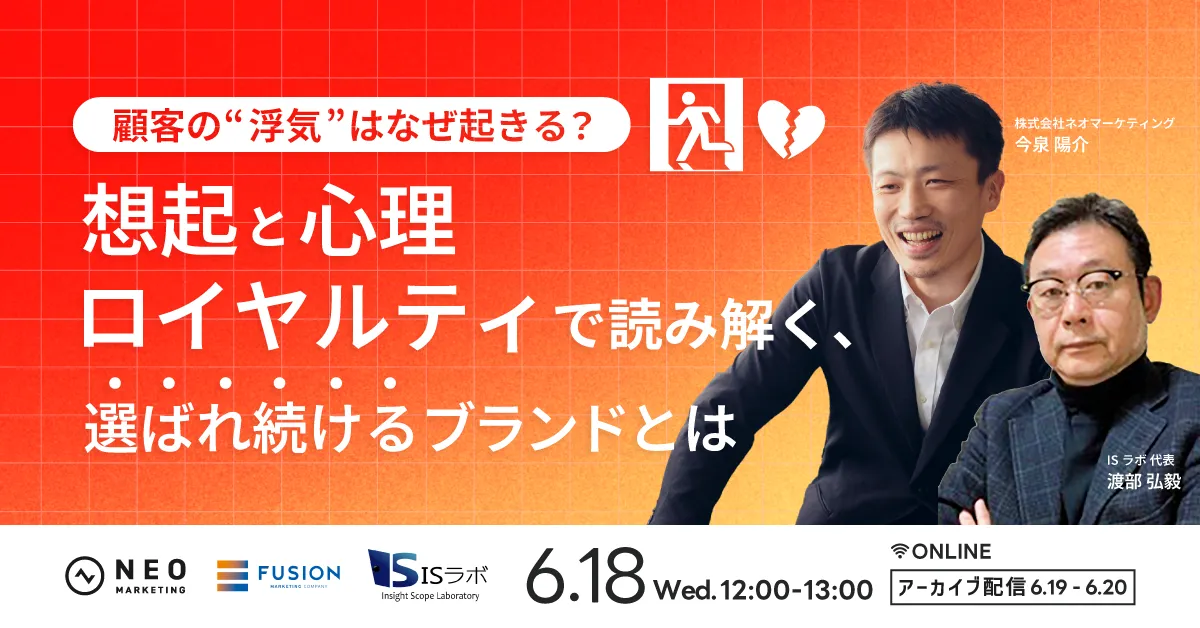 フュージョン株式会社とネオマーケティングが共同で、無償のウェビナーを実施します。このイベントのテーマは、「顧客がなぜブランドを乗り換えるのか?」。消費者が選択する背後には、心理的な要因や記憶が深く影響しています。私たちは、顧客がブランドを「浮気」する理由を探求し、その結果を元に、持続的に選ばれるブランドの戦略を考える時間を提供します。