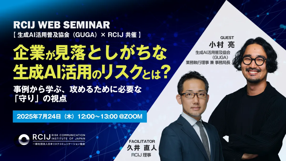 2025年7月24日に、一般社団法人 日本リスクコミュニケーション協会(RCIJ)と一般社団法人 生成AI活用普及協会(GUGA)が共催する無料ウェビナーが開催されます。イベント名は「企業が見落としがちな生成AI活用のリスクとは?事例から学ぶ、攻めるために必要な「守り」の視点」です。本ウェビナーでは、生成AIが企業活動にもたらす潜在的なリスクについての実践的な知見を提供します。