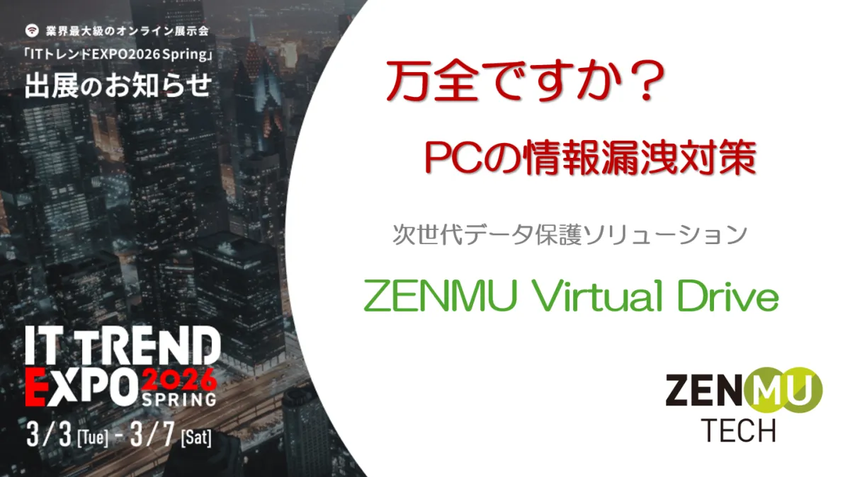 株式会社ZenmuTech(ゼンムテック)は、2026年3月3日から7日までオンラインで行われる「ITトレンドEXPO2026 Spring」に出展することを発表しました。この展示会では、同社が誇るPC情報漏洩対策ソリューション「ZENMU Virtual Drive」を紹介します。