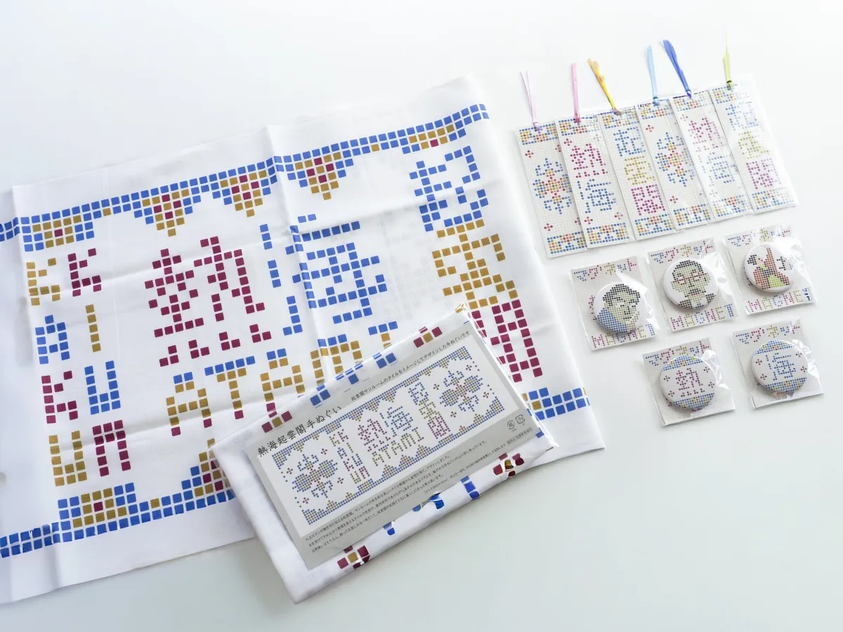 この手ぬぐいは、起雲閣のサンルームのタイル模様に「熱海」という言葉をデザインしています。サイズは340mm×900mmで、小旅行や日常使いにも便利な一品です。販売価格は1,600円(税込)で、温泉や海辺の散策に最適なお供となります。