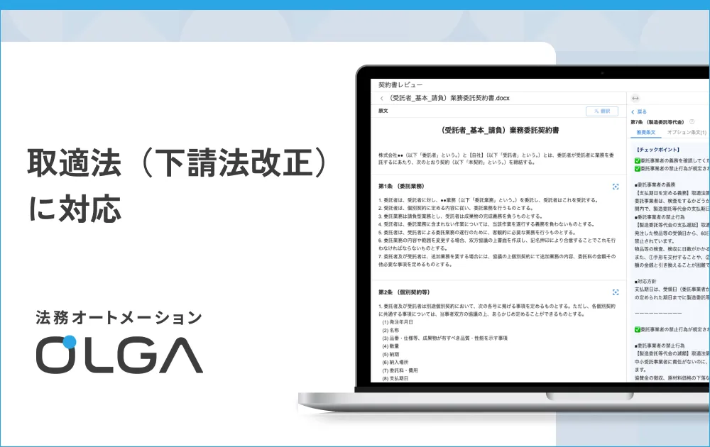 法務オートメーション「OLGA(オルガ)」が新たに取適法に対応したことを発表した。GVA TECH株式会社(本社:東京都渋谷区、代表取締役:山本 俊)は、OLGAに搭載されていた従来の「下請法チェッカー」が、改正された「取引適正化法」(取適法)に基づいてリニューアルされたことをお知らせする。