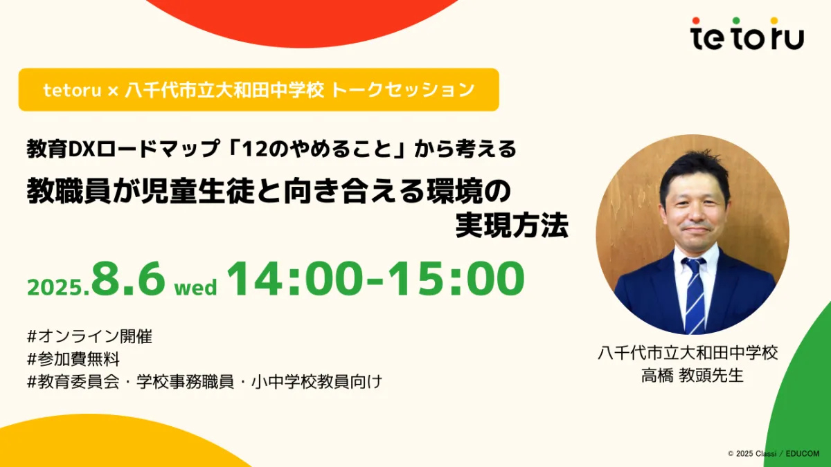 千葉県八千代市立大和田中学校の高橋教頭先生が登壇し、特に「tetoru」の集金機能を活用したデジタル化のノウハウについて詳しく語っていただきます。本セミナーを通じて、学校のDXの実現に向けた具体的な取り組み事例が共有され、教職員が本来の教育活動に集中できる環境づくりの重要性が強調されます。