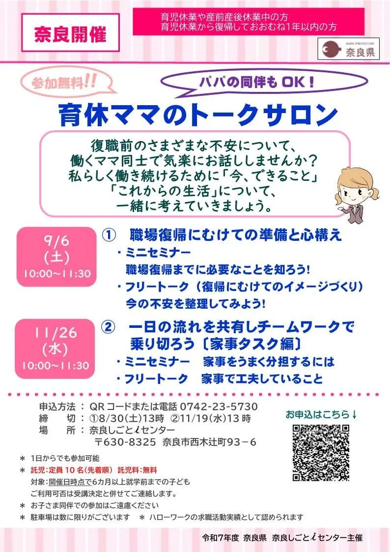 育休中のママたちにとって、職場復帰の準備は心配ごとのひとつであり、今後の生活をどうしていくか考える重要な時期とも言えます。そこで、奈良しごとiセンター(エルトピア奈良)にて、育休ママのためのトークサロンを開催します。このサロンでは、同じ境遇のママ同士で気楽に話し合い、共感し合いながら悩みや不安を解消していく貴重な機会を提供します。