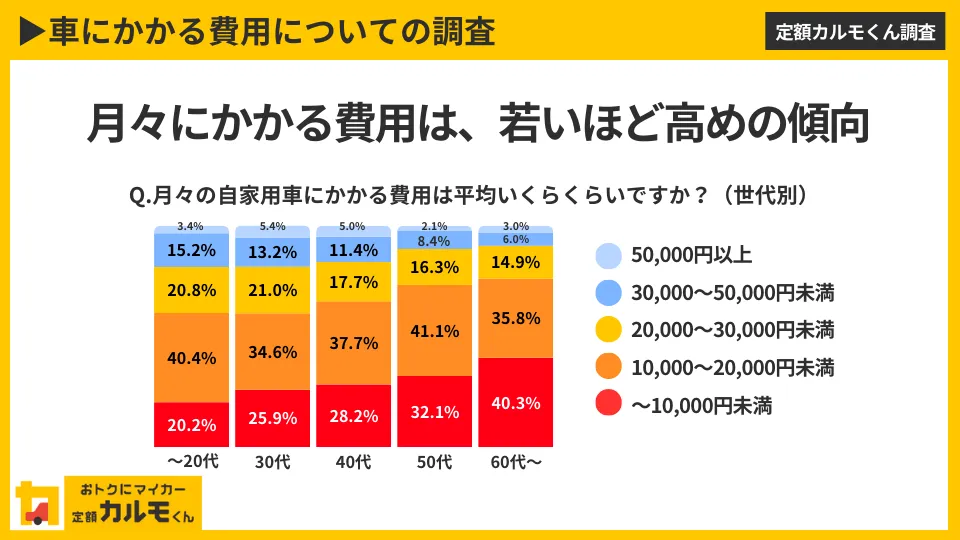 自家用車の費用は、運転する年代によって大きく異なり、若い世代ほど高額になることが最近の調査から明らかになりました。ナイル株式会社が提供するマイカーのサブスクリプションサービス「おトクにマイカー 定額カルモくん」は、家計を管理する1,130人を対象にインターネット調査を実施し、その結果を発表しました。