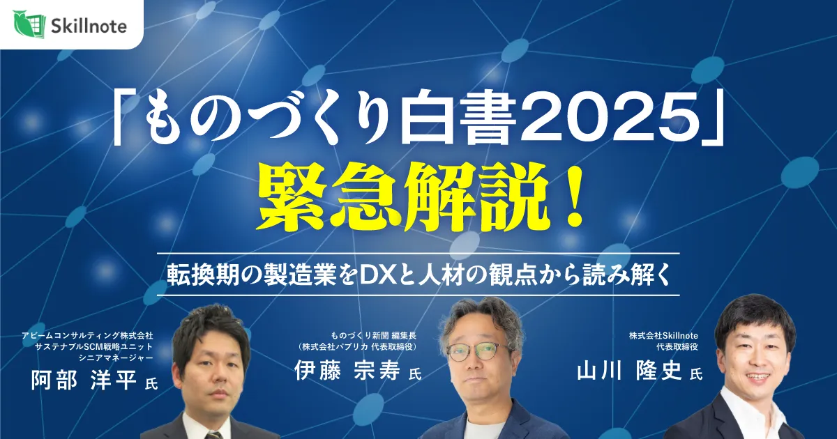 株式会社Skillnoteが主催するセミナーが、2025年7月16日(水)11時より開催されます。今回のテーマは "ものづくり白書2025" です。このセミナーでは、製造業が直面している急激な変化に焦点を当て、特にデジタルトランスフォーメーション(DX)と人材に関する課題を探求します。参加は無料で、事前の申し込みが必要です。