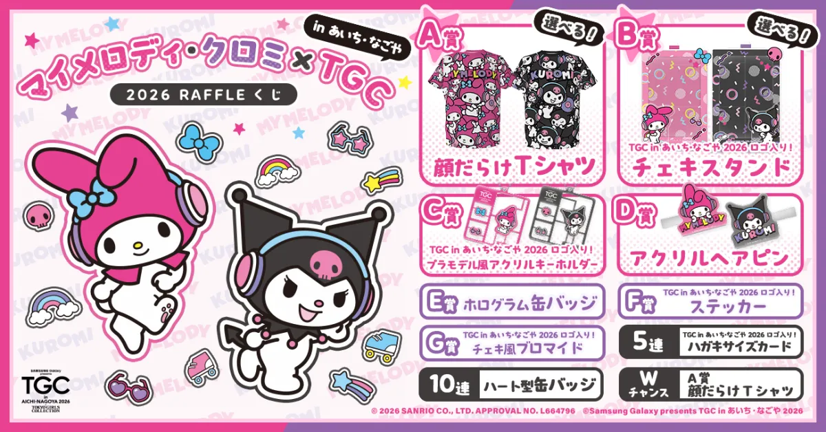この「マイメロディ・クロミ × TGC in あいち・なごや 2026 RAFFLEくじ」は、2026年の2月14日から販売が開始されます。TGC愛知公演の特別な記念企画として位置づけられています。くじでは、ここでしか手に入らないマイメロディとクロミのイラストを使用した多彩なアイテムが用意されています。