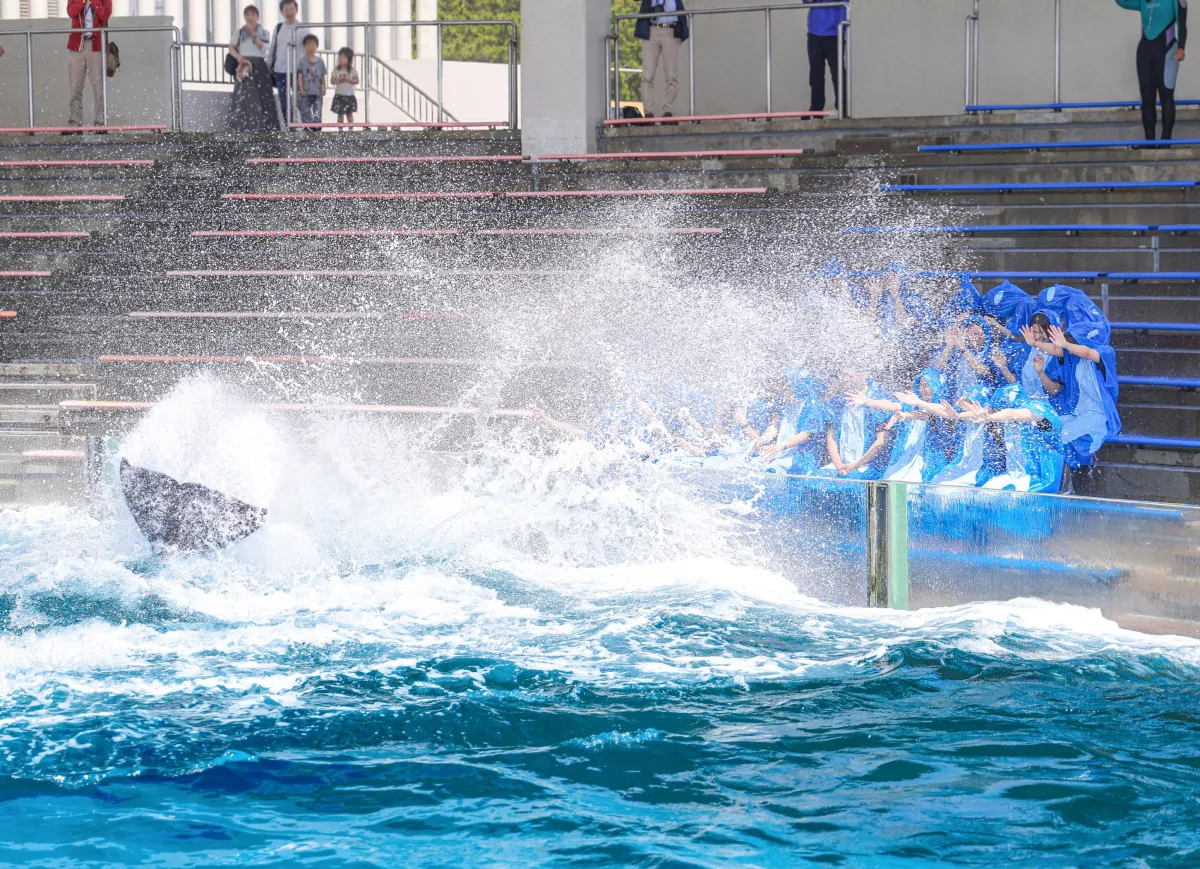 シャチの巨大な尾ビレから飛び出る水しぶきは、参加者にとって驚きと喜びをもたらし、緊張感を一瞬で吹き飛ばしました。会場には歓声が響きわたり、新入社員たちの晴れやかな笑顔が印象的でした。この瞬間を共有した仲間たちは、今後の社会人生活への期待に胸をふくらませたことでしょう。