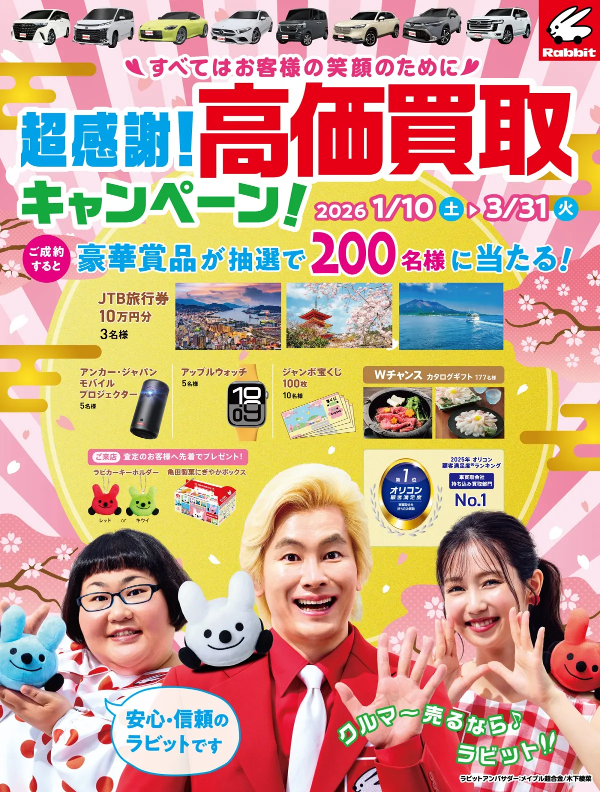 東京都江戸川区に本社を構える株式会社ラビット・カーネットワークが運営する自動車買取・販売の「ラビット」では、新たに『超感謝!高価買取キャンペーン』を実施中です。このお得なキャンペーンは、1月10日から3月31日までの期間限定で行われています。