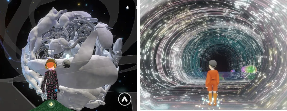 河森正治プロデューサーのもとで構築されたこのパビリオンでは、来場者がさまざまな命やその繋がりを直感的に体験することができます。特に注目すべきは、河森氏がデザインした「いのち球」。現実のパビリオンでは高さ3.5メートルの壮大なモニュメントですが、バーチャル空間ではそのスケールがなんと70メートル!来訪者は様々な生き物に変身し、巨体の「いのち球」を探索することができます。