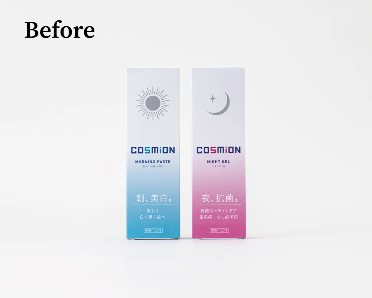 新しいコスミオンのパッケージは、洗練されたデザインで美容や健康を追求するお客様にとって、選びやすくなっています。モーニングペーストとナイトジェルの効果を視覚的に示すことで、購入時の選択基準を明確にしました。「歯磨き粉を使い分ける」重要性を、より多くの方々に理解してもらうための取り組みでもあります。