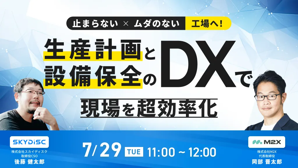 製造業における生産現場では、デジタルトランスフォーメーション(DX)が重要なテーマとなっています。株式会社スカイディスクと株式会社M2Xは、今回「止まらない x ムダのない工場へ!」をテーマに、セミナーを共催します。このセミナーでは、生産計画の最適化と設備保全のDXによって、現場を効率的に改善する方法を探ります。