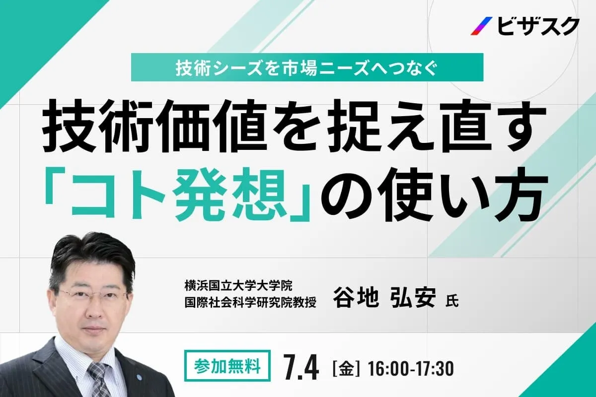 株式会社ビザスクは、2023年7月4日(金)16時から、「技術価値を捉え直す「コト発想」の使い方」をテーマにした無料オンラインセミナーを開催します。このイベントでは、横浜国立大学の谷地弘安教授を講師に迎え、企業が保持する技術シーズを市場ニーズに適応させる知識と方法を提供します。