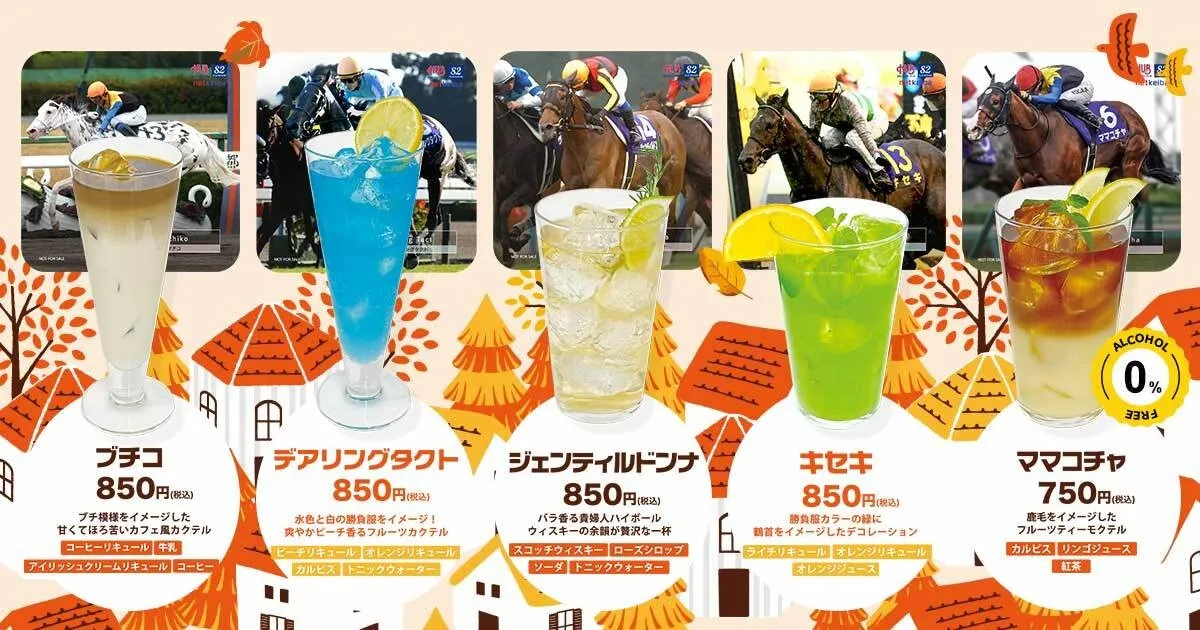 コラボドリンクは、名馬「キセキ」、「ジェンティルドンナ」、「デアリングタクト」、「ブチコ」、「ママコチャ」をテーマに展開され、それぞれの個性をカクテルで表現しています。各カクテルには独自の名前とアプローチがあり、見た目も味も楽しめる仕上がりになっています。
