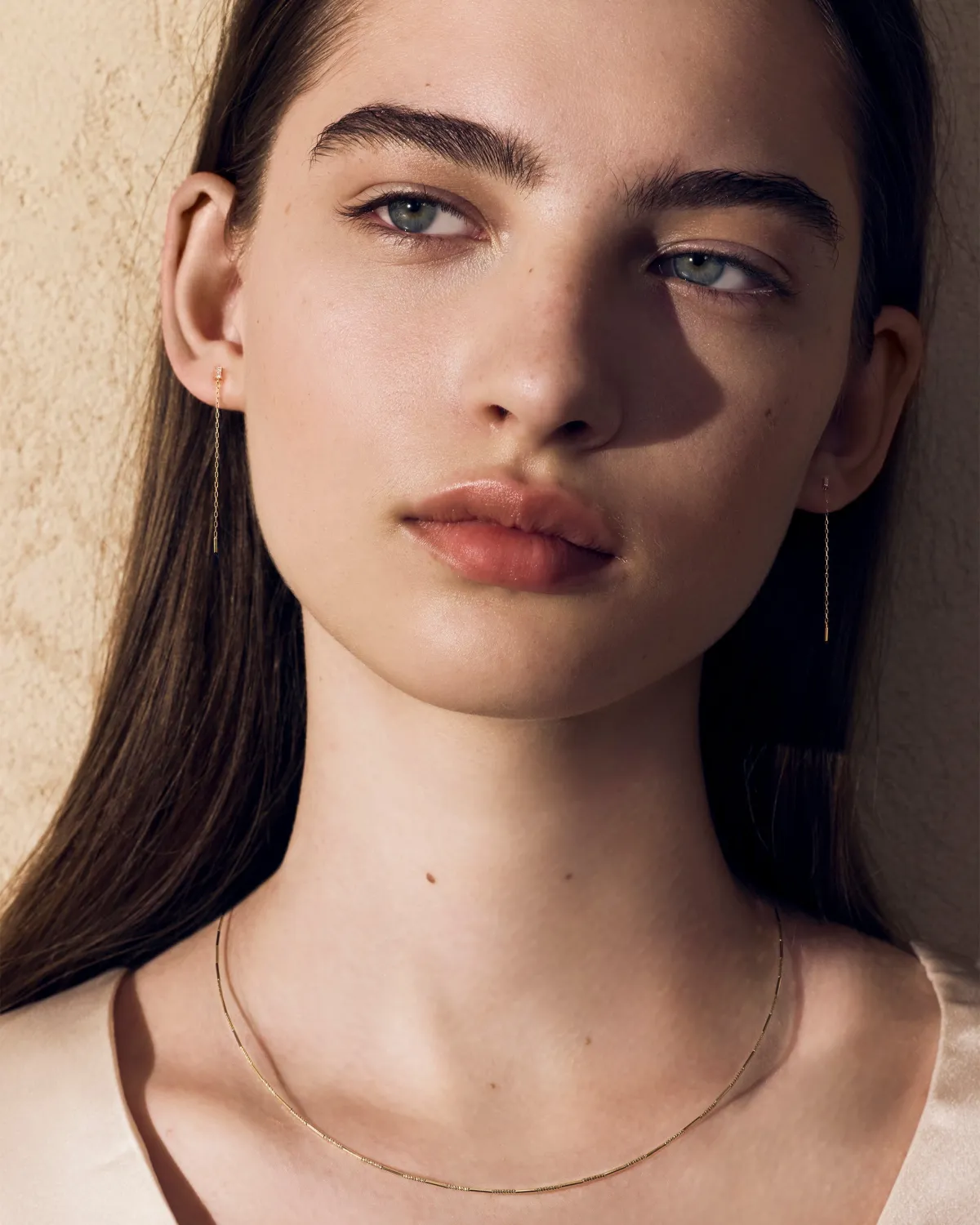 さらに、最小限の石枠で仕上げたバゲットカットのダイヤモンドネックレスやリングもラインナップされています。スクエア型の面が輝き、凛とした印象を与えてくれます。日常使いにも最適なデザインです。指先を美しく見せる極細のリングもぜひチェックしたいアイテム。