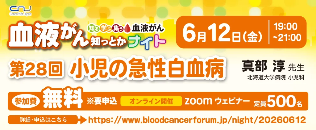 認定NPO法人キャンサーネットジャパンは、2023年から毎月1回、血液がんに関するオンラインセミナー「血液がん知っとかナイト」を実施しています。28回目となる2026年6月のテーマは「小児の急性白血病」です。イベントへの参加は全国どこからでも可能で、病院に入院中の方でも手軽に参加できます。
