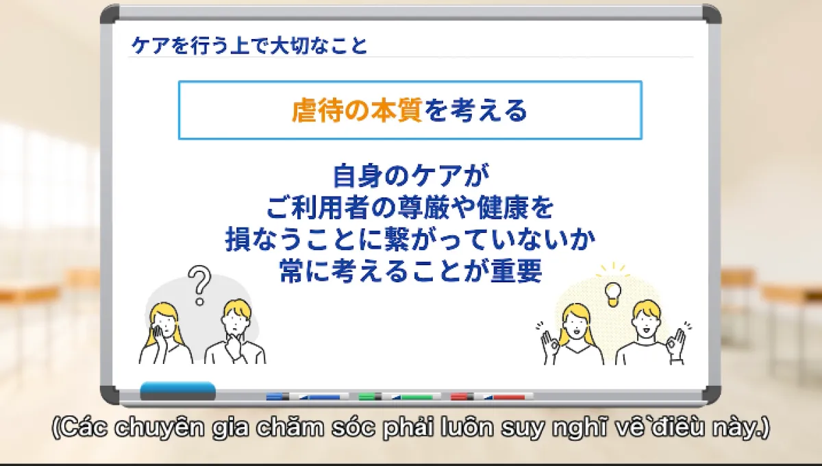 「DM-study」では、利用者が医療・介護についての知識を身に付けるためのコンテンツが豊富に揃っています。具体的には、日本語以外に英語、ベトナム語、インドネシア語、タガログ語の5ヶ国語での字幕対応を実施します。これにより、言葉の壁が原因で生じる教育の遅れを解消し、全職員が一貫した質の高い教育を受けられる環境を整備しています。