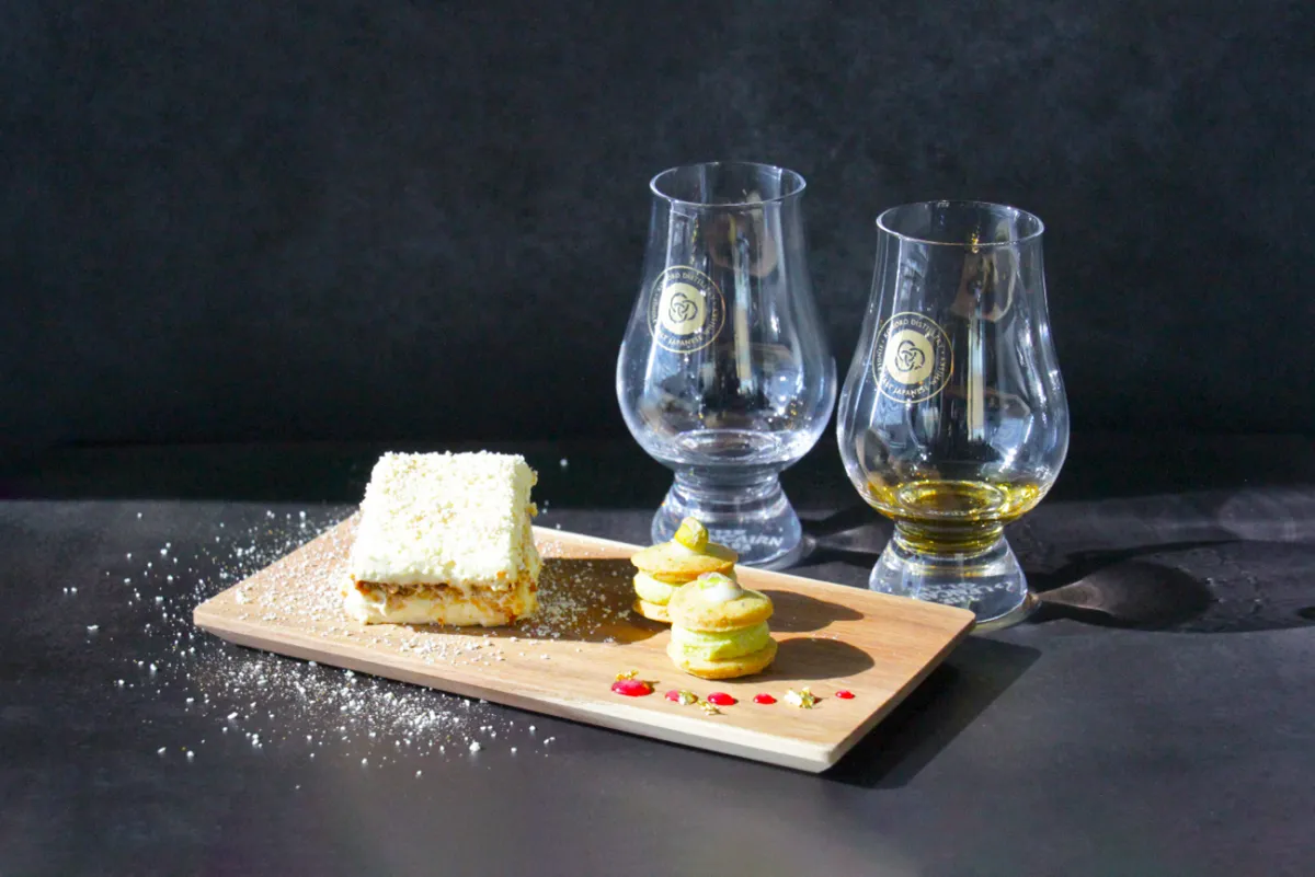 この冬に新たに提供される「KOMORO Sweets Pairing Experience Winter」プランは、ピーテッドニューメイク(熟成前原酒)とピーテッドニューボーン(熟成3年未満の原酒)に、オリジナルスイーツを組み合わせた特別なチケットセットです。料金は4,300円となっており、楽しめるスイーツはホワイトティラミスとピスタチオクリームサンドの2種類です。