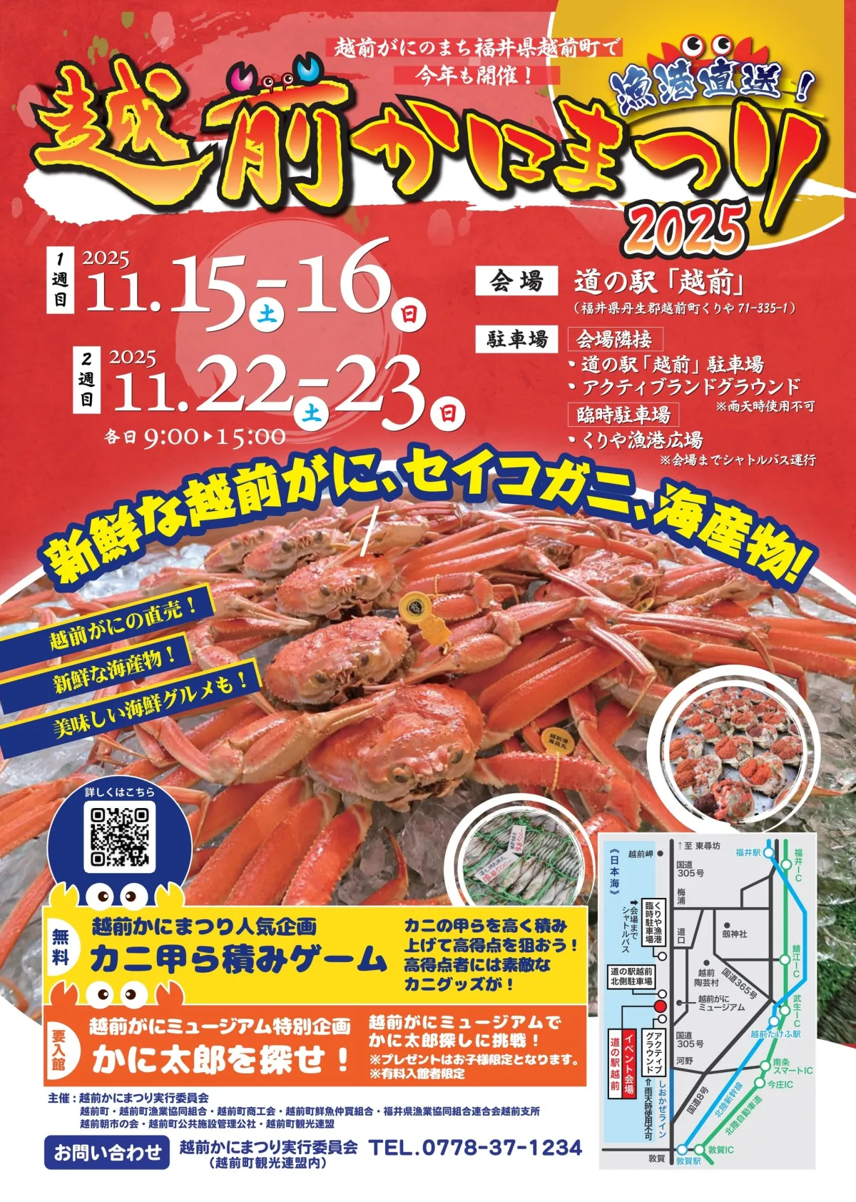 2025年11月15日と16日、さらに22日と23日の2週にわたって、福井県越前町の道の駅越前において、恒例の「越前かにまつり」が開催されます。越前町は、ズワイガニの中でも最高級品として知られる「越前がに」の産地であり、この祭典はその美味しさを広めるための大人気イベントです。