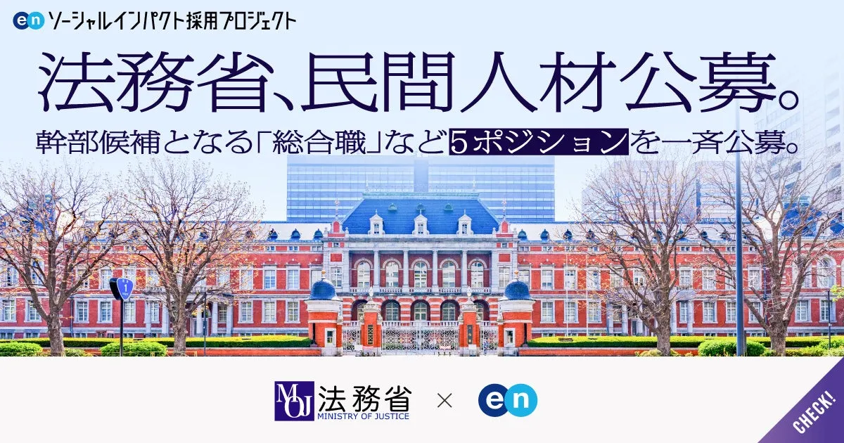 法務省が2025年10月23日から、エン株式会社と連携して幹部候補の総合職など5つのポジションを一斉に公募することを発表しました。エン株式会社は東京都新宿区に本社を置く採用支援企業であり、法務省の『ソーシャルインパクト採用プロジェクト』の一環としてこの取り組みが行われます。