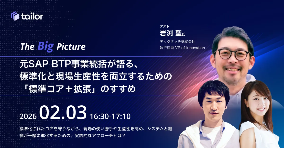 2026年2月3日(火)に、テイラー株式会社が主催するウェビナー『The Big Picture』が開催されます。このイベントは、ヘッドレスERPプラットフォームを提供するTailor Technologies, Inc.が贈るウェビナーシリーズの第8回目として配信され、基幹システムの標準化と現場生産性の両立に焦点を当てています。今回は、テックタッチ株式会社の執行役員である岩渕聖氏をゲストスピーカーとして迎え、企業における基幹システムの改革についての貴重な視点が提供されます。