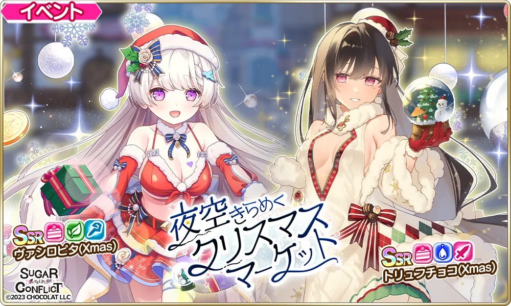 「夜空きらめくクリスマスマーケット」では、クリスマス仕様の衣装をまとったキャラクターたちが登場します。美少女たちと一緒に聖夜を楽しみながら、彼女たちの活躍するストーリーも楽しんでください。過去のクリスマス衣装キャラクターも手に入る機会も待っています!