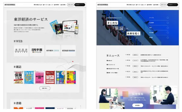 リニューアルされた東洋経済新報社のコーポレートサイトは、さまざまな情報を直感的にアクセス可能にした設計になっています。ユーザビリティを重視したUI/UXデザインが採用されており、閲覧者が求める情報に素早く辿り着けるよう配慮されています。また、各種事業内容について詳しい情報ページが作成されており、同社の取り組みや特徴を分かりやすく紹介しています。