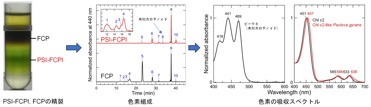 研究チームは、Pavlova sp.という藻類から光化学系の複合体を精製し、これまでの全細胞抽出液では確認されていなかったクロロフィルc2類似分子を初めて特定しました。また、PSI-FCPI内部に存在する未知のカロテノイドも発見され、その吸収極大が418/441/469 nmであることが確認されました。これにより、光捕集や光保護に関する新たな分子機構の解析が進むことが期待されています。