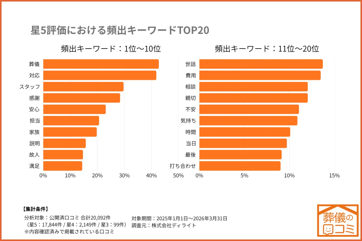 葬儀に関する口コミは、ユーザーがサービスを評価する重要な基準の一つです。株式会社ディライトが提供する葬儀専門の口コミサイト「葬儀の口コミ」では、2025年から2026年にかけて投稿された20,092件の口コミを分析し、評価の背後にある要因を明らかにしました。この分析によると、星5評価と星4評価を分ける要素は「感動」であることが判明しました。