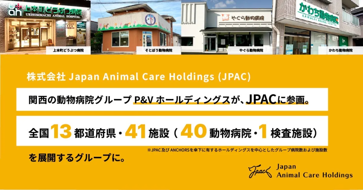 最近、関西を基地とする動物病院グループのP&Vホールディングスが、株式会社Japan Animal Care Holdings(JPAC)のグループに参加したとのニュースが入ってきました。この動きにより、全国各地に41の動物病院を有する新しい体制が整備されることとなります。