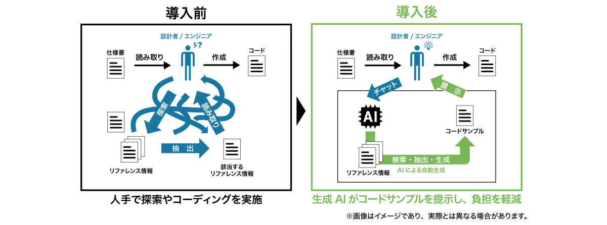 AIは抽出した情報を元に、エンジニアにコーディングのベースとなるサンプルを提示します。これにより、専門的な知識を必要とする工程が簡略化され、熟練者への依存度が下がることが期待されています。つまり、若手エンジニアでも質の高いコードを迅速に生成できる状態が実現します。