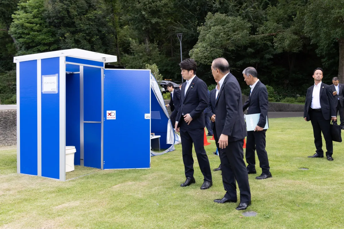 さらに、安全対策器具や避難訓練用器具の紹介も行われ、特別に大口径管路でのドローン飛行デモンストレーションも実施されました。これは、実際の作業現場での応用可能性を示すもので、多くの来場者の興味を引きました。視察中には、災害用マンホールトイレの視察や高圧洗浄車、強力吸引車のデモンストレーションも行われ、見学者はその技術の実態を目の当たりにしました。