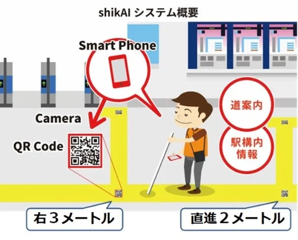 「shikAI」は、iPhoneを活用したナビゲーションシステムで、駅内の点字ブロックに貼付されたQRコードをスキャンすることで、音声ガイドにより現在地から目的地までの移動をサポートします。これにより、視覚に障がいをお持ちの方々は、よりスムーズに駅を利用できるようになります。