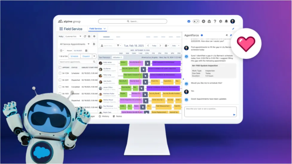 新たに登場したAgentforceは、事前に作成されたトピックやアクションを駆使し、データの統合を行うことにより、作業員と顧客にインテリジェントなサービスを提供します。このAIプラットフォームは、スケジュールの予約や調整を自動化し、技術者は本来の業務——修理や顧客とのリレーションシップに集中することができます。