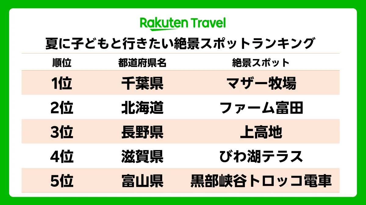 楽天グループ株式会社が運営する旅行予約サイト、楽天トラベルは、子育て中のママやパパ向けの無料メンバーシッププログラム「楽天ママ割」の会員を対象に、夏に家族で訪れたい絶景スポットに関するアンケートを実施しました。その結果、注目のランキングが発表されました。