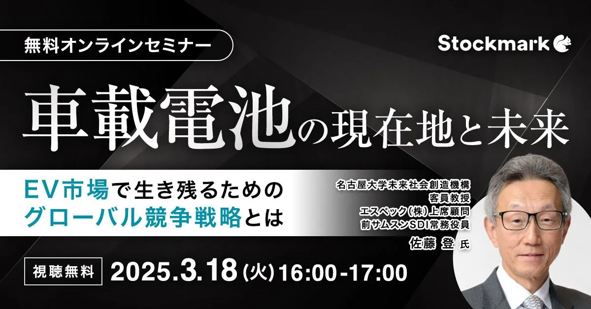 ストックマーク株式会社は、2025年3月18日(火)に「車載電池の現在地と未来— EV市場で生き残るためのグローバル競争戦略とは」と題したオンラインセミナーを開催します。このセミナーでは、急速に進化するEV市場における車載電池の役割と、未来に向けた競争戦略について深掘りします。