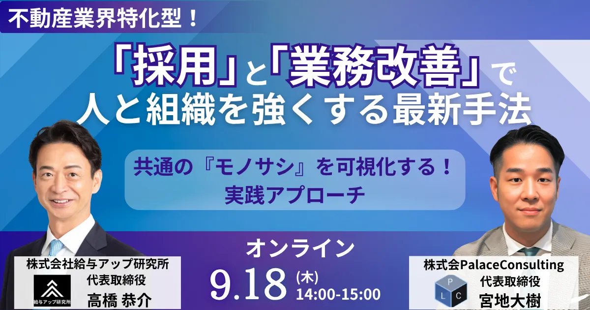2025年9月18日(木)14:00から、不動産業界に焦点を当てた無料オンラインセミナー「採用と業務改善で人と組織を強くする最新手法」が開催されます。主催は、東京都千代田区に本社を置く株式会社給与アップ研究所と、東京都品川区の株式会社Palace Consultingが共同で行います。