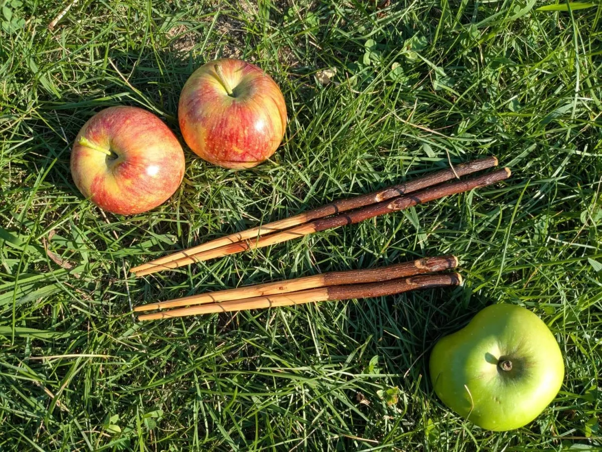 自分だけの箸を作る体験では、飯綱町在住の木工作家、古川葉子さんの指導の下で、剪定したリンゴの枝を小刀で削り、自分の好みに合わせた長さや太さ、曲がり具合を調整します。最後にはクルミの油で磨いて、唯一無二のマイ箸が完成します。小刀を使用するため、子供は大人の同伴が必要です。