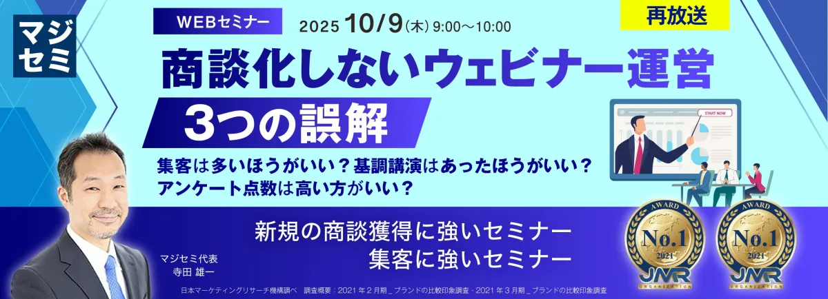 このセミナーでは、年間1,200回以上のウェビナーを支援しているマジセミ代表・寺田氏が登壇し、成功するウェビナー運営のノウハウをお話しします。ポイントは、量ではなく質。「どうすれば質の高いリードを獲得し、商談に結びつけるか」という視点で具体的な運用設計を解説します。