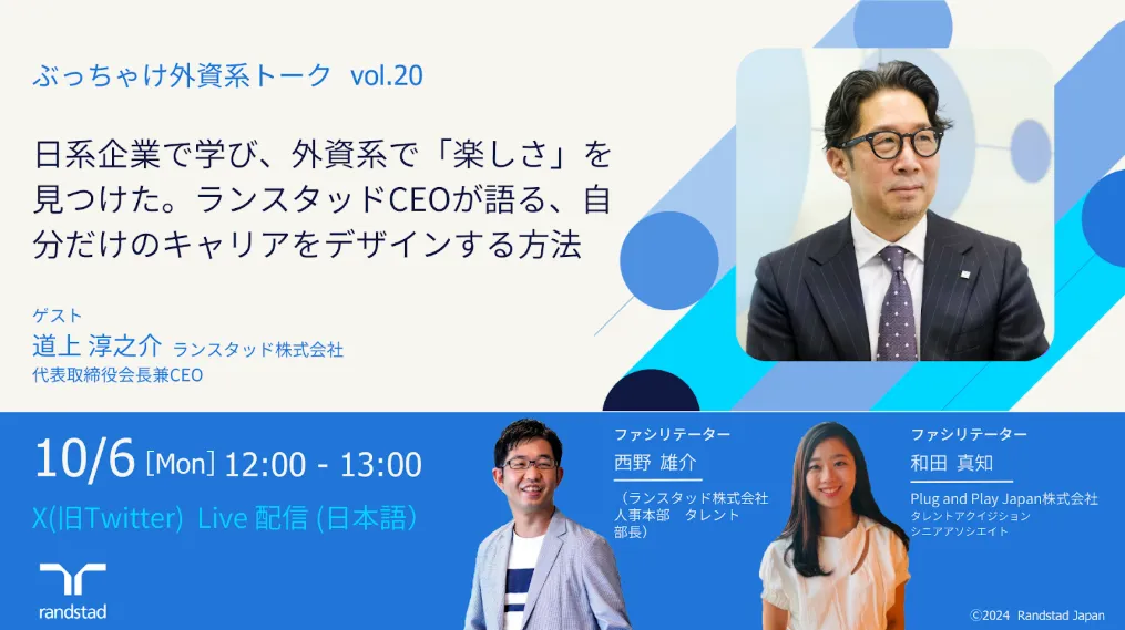 2025年10月6日(月)、ランスタッド株式会社が主催する年に一度の特別イベント「ぶっちゃけ外資系トーク」の第20回が、ソーシャルメディアX(旧Twitter)スペースで開催されます。このイベントでは、同社代表取締役兼CEOの道上淳之介氏がゲストとして登壇し、外資系企業での成功を掴むための戦略や自身の経験について熱く語ります。