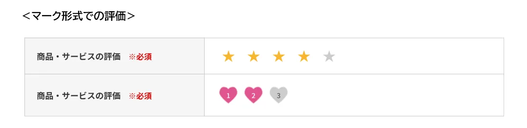 選択肢には、星やハートなどのマーク、ラジオボタン、さらには点数形式が利用可能で、回答選択肢の表示数を3~5個の間で設定できるのも魅力です。また、ラジオボタン形式や点数形式では、具体的な評価ラベル(例:「とても満足」「普通」「不満」など)を自由に設定することも可能。これにより、アンケートや評価の設計が一層自由度が高くなり、目的に応じた運用が迅速に実現します。