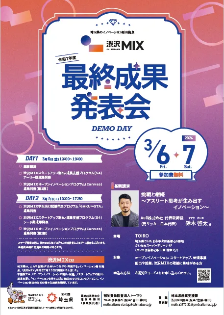 埼玉県のイノベーション創出拠点である「渋沢MIX」は、令和7年7月25日に公式にオープンしました。この拠点は、オープンイノベーションの推進、スタートアップの育成、イノベーションを担う人材の育成の3つの目的のもとに展開されています。そんな渋沢MIXの活動の集大成ともいえる「最終成果発表会」が、2024年3月6日(金)と7日(土)の2日間にわたり開催されます。