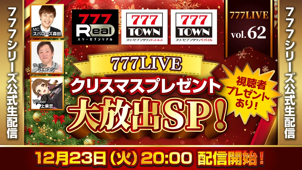2025年12月23日(火)20時より、パチンコ・パチスロ愛好者必見の生配信イベント「777LIVE Vol.62」が開催されます。このイベントは、株式会社サミーネットワークスが手掛ける「777TOWN」と「777Real」を活用した、贅沢なクリスマスプレゼント企画として行われます。