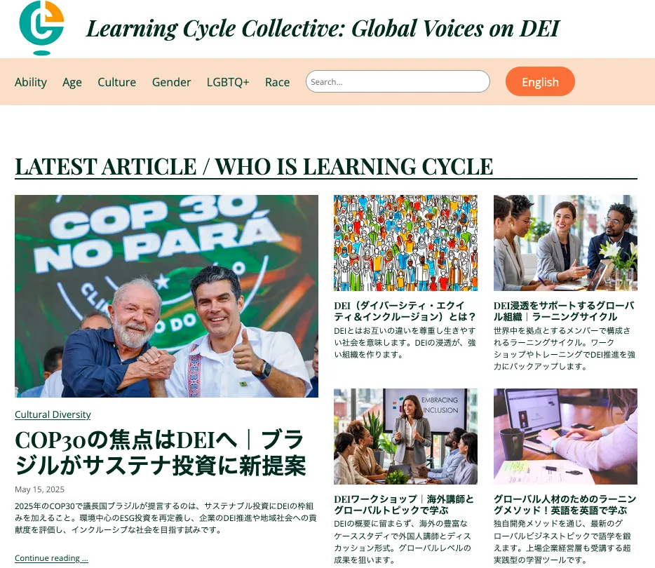 ラーニングサイクルは国内外で展開する多様なメンバーで構成されるグローバルスタートアップであり、DEIに特化したメディアも運営しています。これにより、様々な国や地域で起こっているDEIに関する動きを知り、取り組みを進めることができています。個々のニーズに応じた教育やワークショップを法人向けに提供し、社会に貢献するための活動を続けています。
